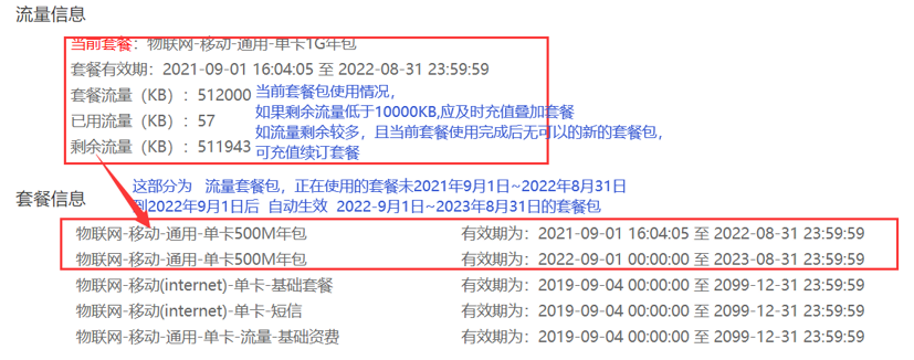 如当前套餐为暂无,且弹出信息不含有 物联网-移动-通用-单卡500M年包或其他流量包,卡已经停机,因及时购买续订套餐。